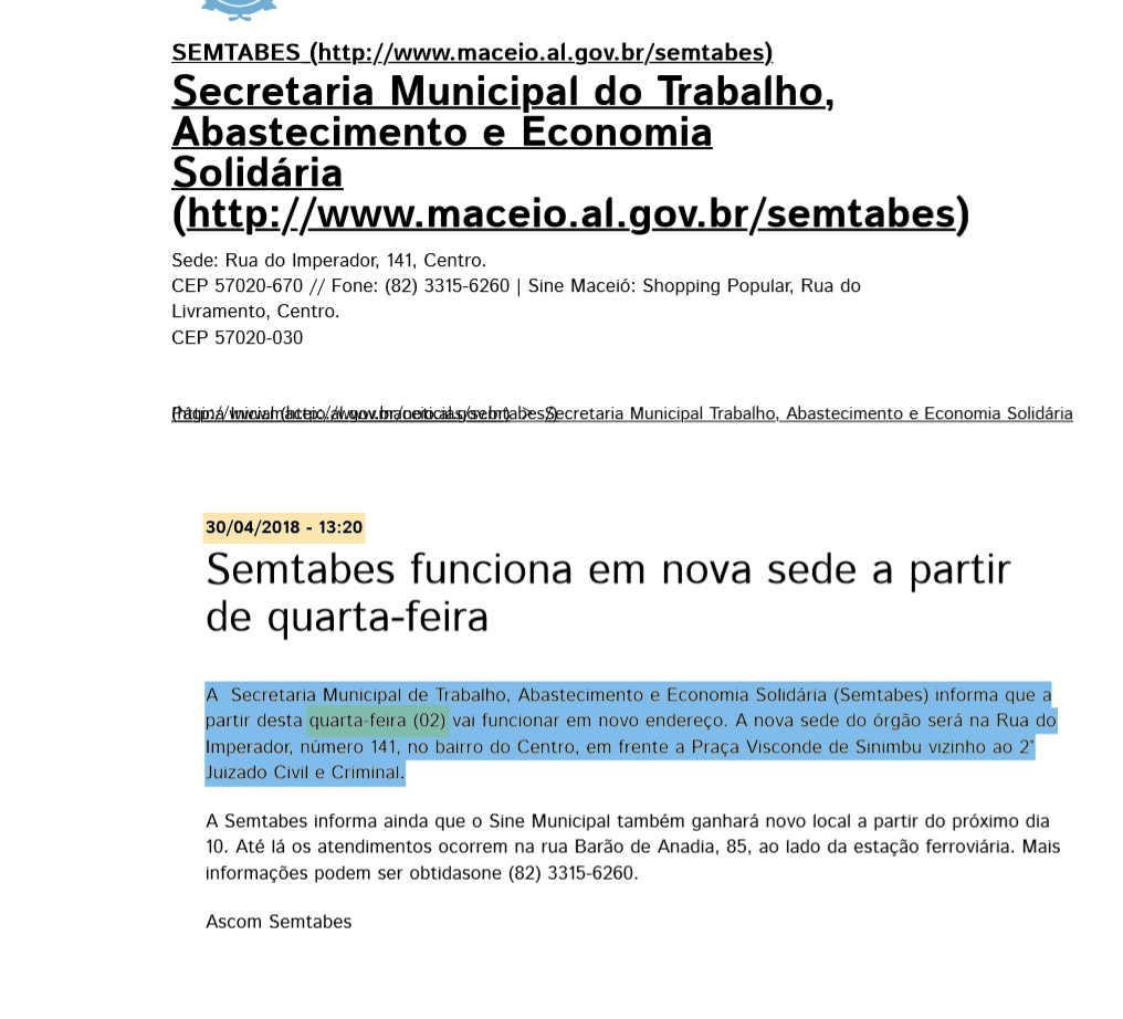 Na publicação realizada no último dia 30 de maio, o texto esclarece que o imóvel é contratado pelo período de um ano mediante ao informe. Por outro lado, uma notícia publicada no próprio portal da Prefeitura de Maceió prova o contrário, quando informa um mês antes da efetivação do contrato que a Semtabes iria funcionar a partir do dia 2 de maio, no novo endereço.