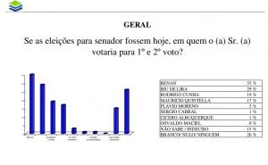 Para o Senado, a escolha do eleitor foi pelos candidatos a reeleição para ocupar as duas vagas como representantes de Alagoas. Renan Calheiros (MDB) teve 35% das intenções de votos, enquanto Benedito de Lira (PP) obteve 29%.