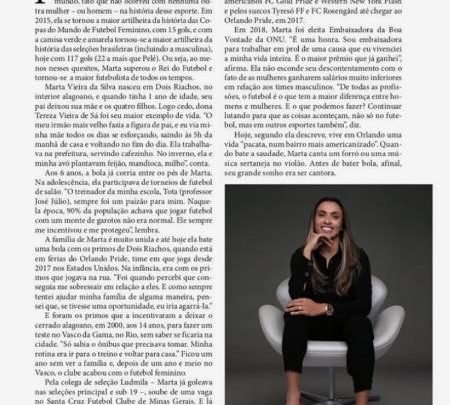 A capa da nova edição da revista Forbes Brasil traz as mulheres mais poderosas do país, e entre elas está Marta. Eleita seis vezes a melhor jogadora do mundo pela Fifa, a atacante da seleção brasileira e do Orlando Pride divulgou a revista em suas redes sociais.