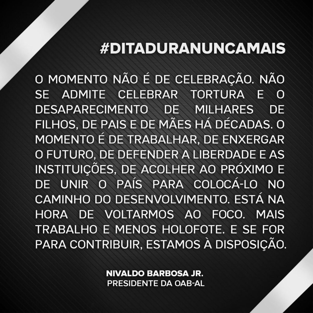 Agora, 55 anos depois, o presidente Jair Bolsonaro, admirador declarado do torturador e assassino, coronel Brilhante Ustra, reestabelece a comemoração do Golpe Militar de 1964 nos quartéis. A OAB de Alagoas também emitiu nota de repúdio contra a comemoração do golpe.