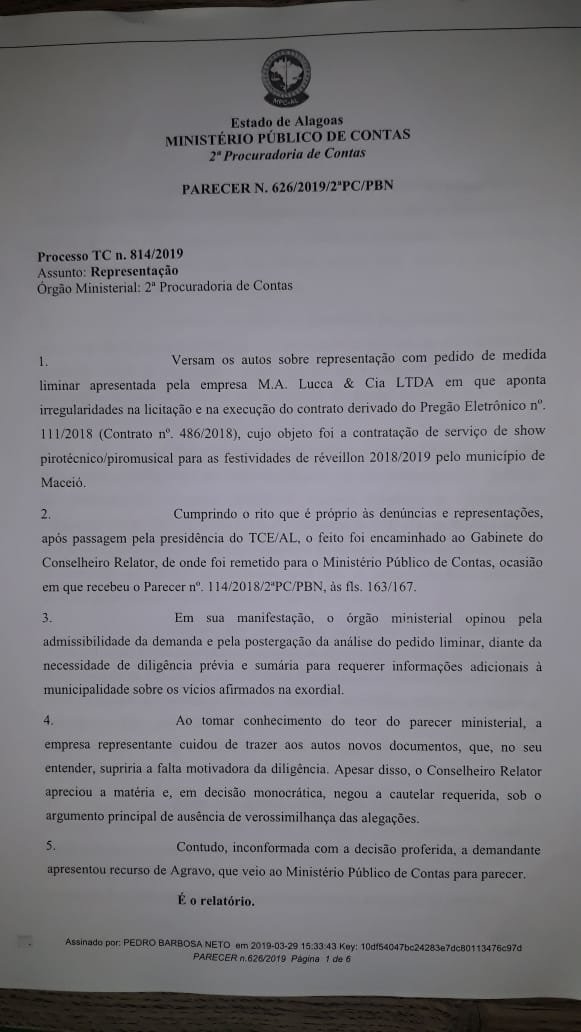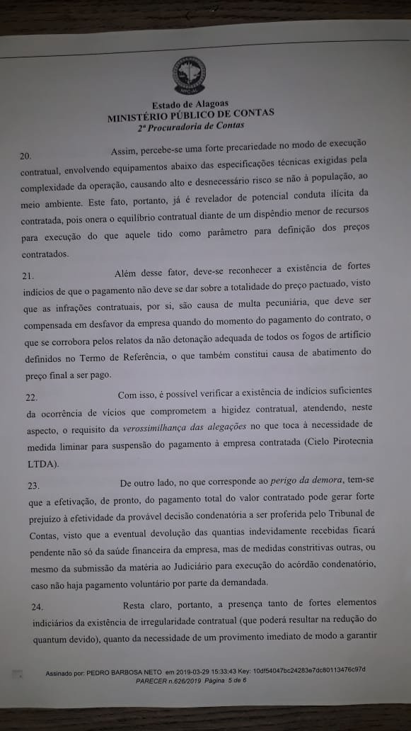 Após denúncia feita pelo portal A Notícia sobre as irregularidades na execução dos serviços de queima de fogos no ano novo em Maceió, o Ministério Público de Contas determinou a suspensão do pagamento à empresa responsável pela atividade.