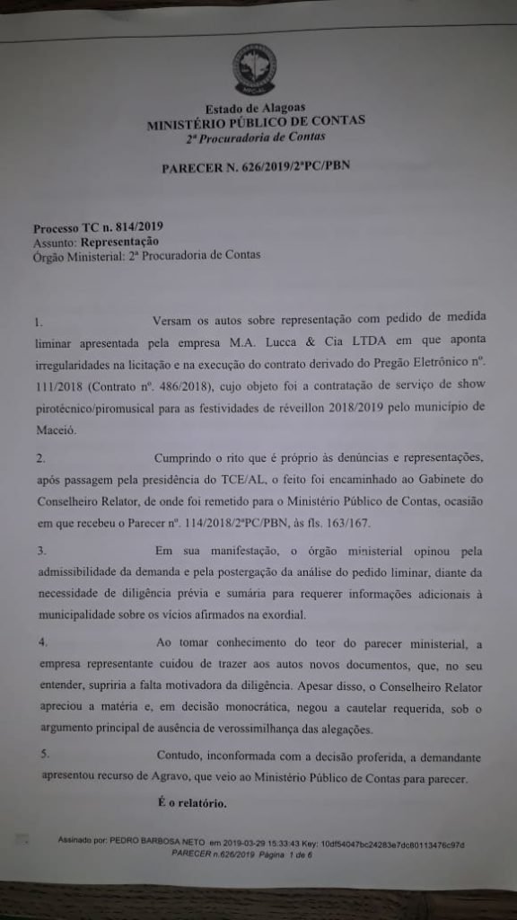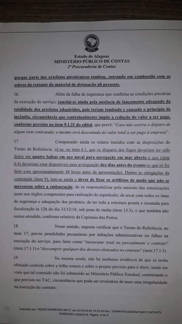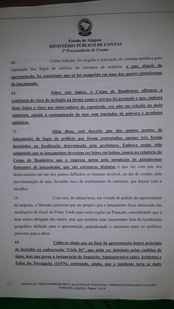 De acordo com relatório da Capitania dos Portos enviado ao Ministério Público Estadual de Alagoas, a vencedora da licitação, a Cielo Pirotecnia LTDA, não utilizou embarcações previstas no Termo de Ajustamento de Conduta (TAC) assinado entre a prefeitura da capital, MPE, concorrentes da licitação e órgãos fiscalizadores, no dia 13 de dezembro de 2018.