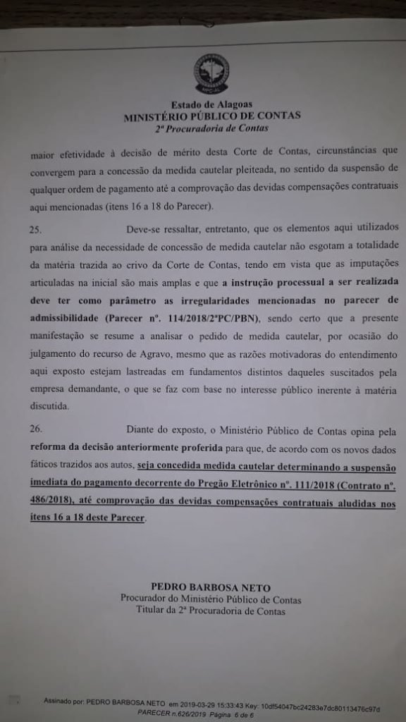 Agora com o parecer do MPC sobre o agravo, o caso vai para o plenário do Tribunal de Contas do Estado.