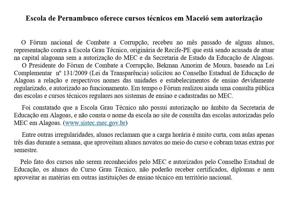 Ainda de acordo com o MP/AL, eram oferecidos os cursos de graduação fora das suas respectivas sedes e quando os alunos estavam prestes a concluir a graduação, o conteúdo programático era “aproveitado” pela sede e o diploma emitido por ela.
