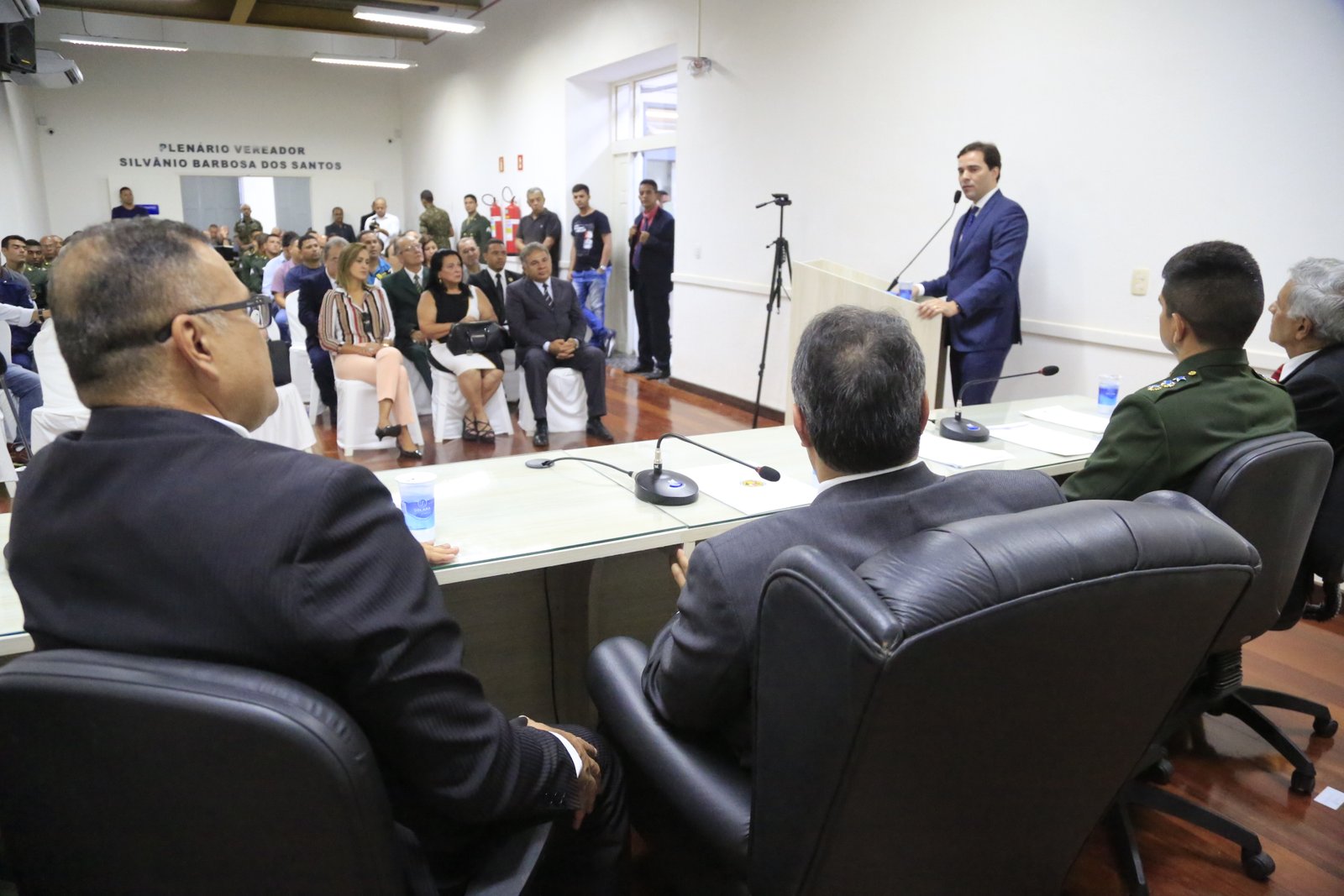 A Câmara Municipal de Maceió realizou, na manhã desta terça-feira (30), no Plenário Silvânio Barbosa, sessão solene em homenagem aos 371 anos de trabalho do Exército brasileiro, além de agraciar o subcomandante do 59° Batalhão de Infantaria Motorizado, Rodrigo Giacomelli, com o Título de Cidadão Honorário. A sessão foi de iniciativa do presidente da Casa, Kelmann Vieira (PSDB), e a honraria foi proposta pelo vereador licenciado, Eduardo Canuto (PSDB).