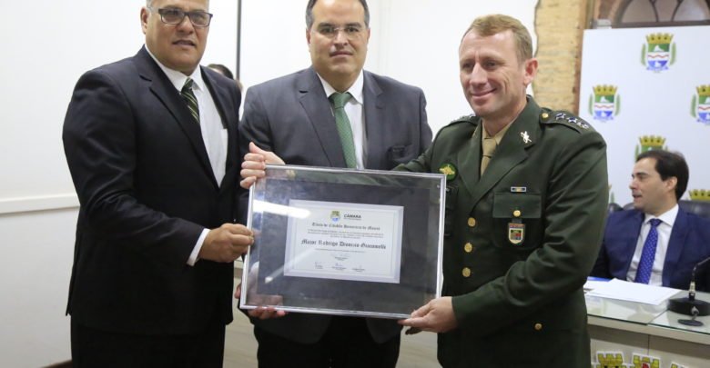 O parlamentar ainda agraciou o Major Rodrigo Dionizio Giacomelli com o Título de Cidadão Honorário. “Acredito que a concessão do título ao major é o reconhecimento, mais que justo, do povo maceioense a esse incansável profissional que através de seu dignificante trabalho contribui para elevar a qualidade de vida de nossa querida cidade. Seja bem vindo-vindo a sua nova cidade”.