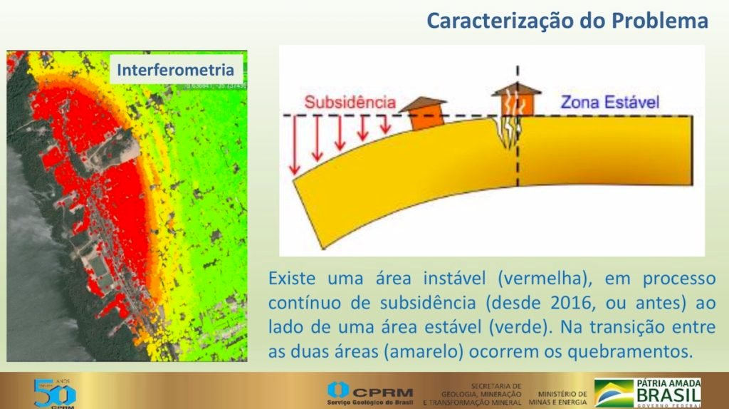 1 – Está ocorrendo desestabilização das cavidades provenientes da extração de sal-gema, provocando halocinese (movimentação do sal) e criando uma situação dinâmica com reativação de estruturas geológicas preexistentes, subsidência e deformações rúpteis em superfície em parte dos bairros Pinheiro, Mutange e Bebedouro, Maceió-AL