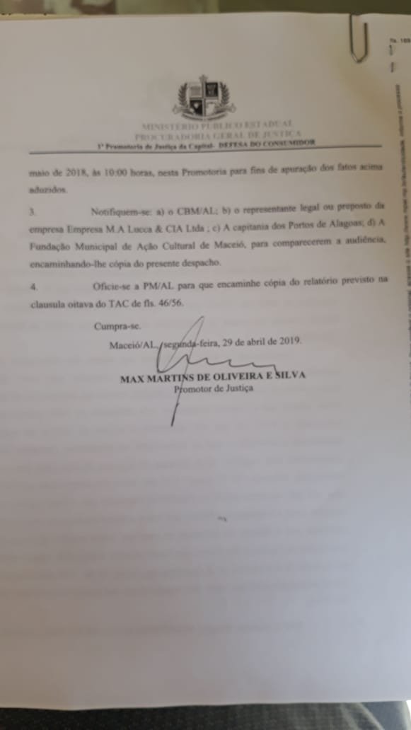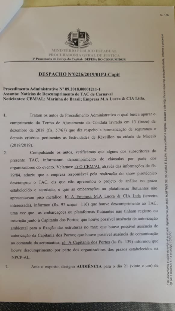 O promotor de Justiça Max Martins agendou para o próximo dia 21 de maio a audiência que irá apurar condutas de descumprimento do Termo de Ajuste de Conduta feito pelo Ministério Público de Alagoas (MPAL) para queima de fogos no réveillon de Maceió, proporcionado pela prefeitura.