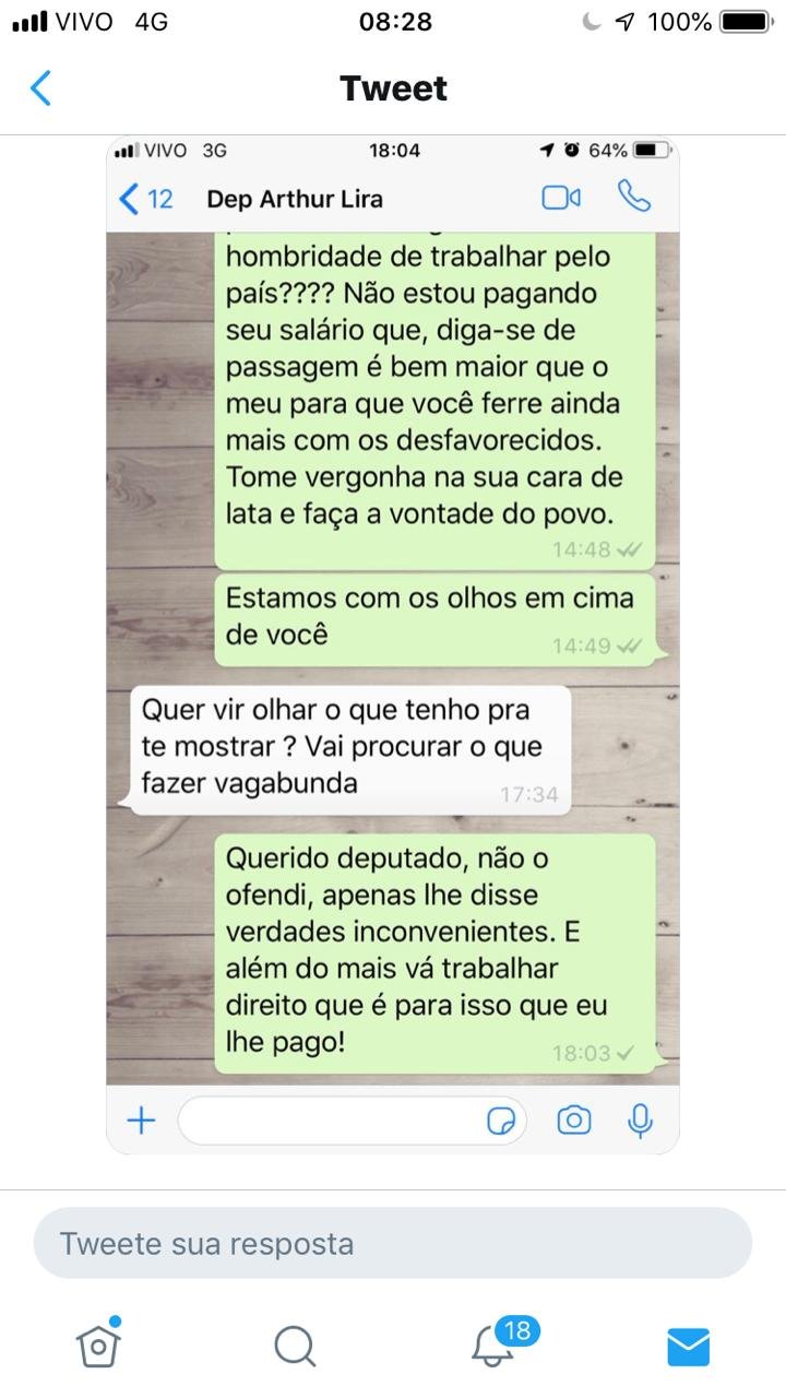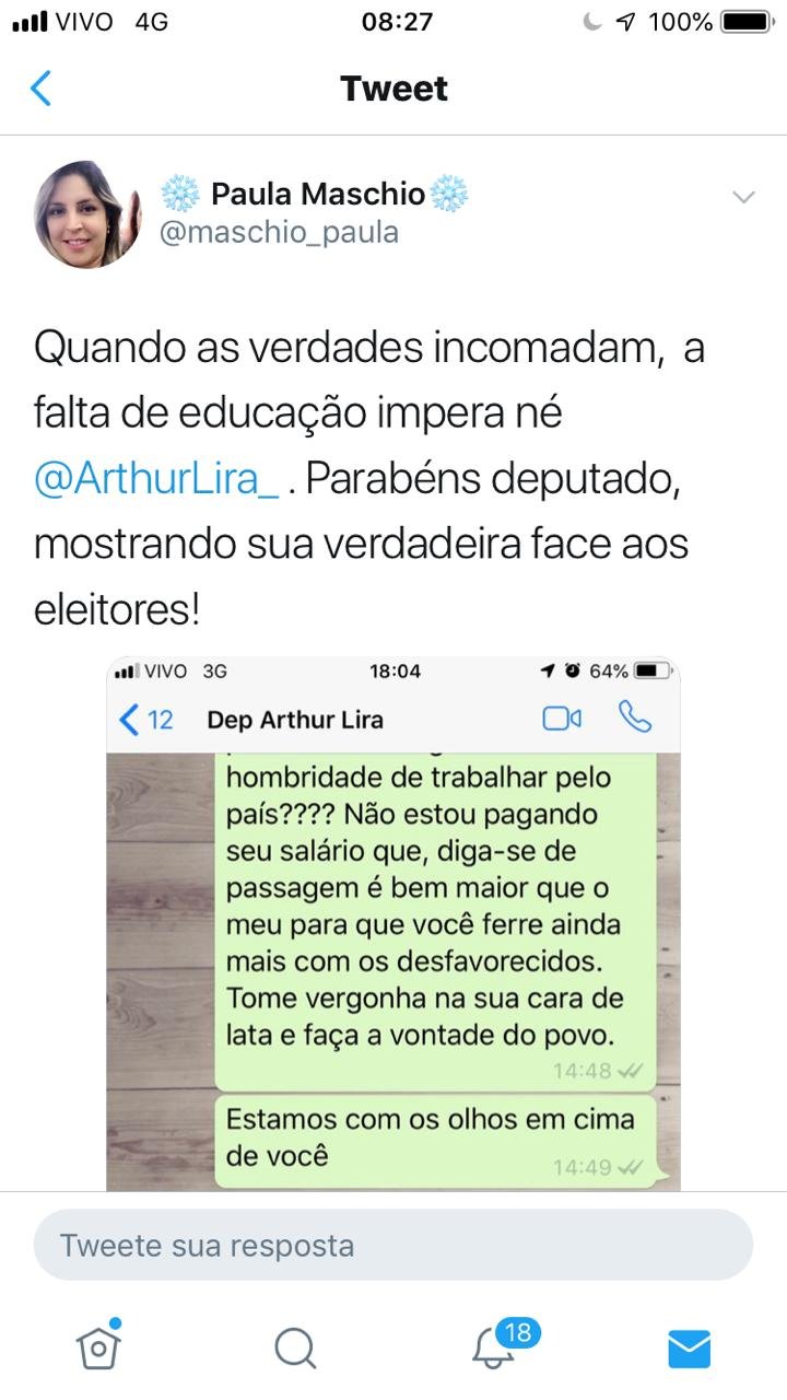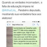 Como resposta, o filho do ex-senador Benedito de Lira (PP) respondeu: “Quer vir olhar o que tenho pra te mostrar? Vai procurar o que fazer, vagabunda”.
