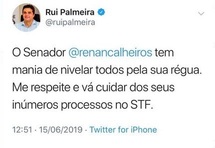 O sábado, 15, foi quente na política alagoana. O senador Renan Calheiros (MDB) lembrou que o prefeito de Maceió Rui Palmeira (PSDB) foi citado na Lava Jato e o gestor não gostou. Toda discussão foi via Twitter.
