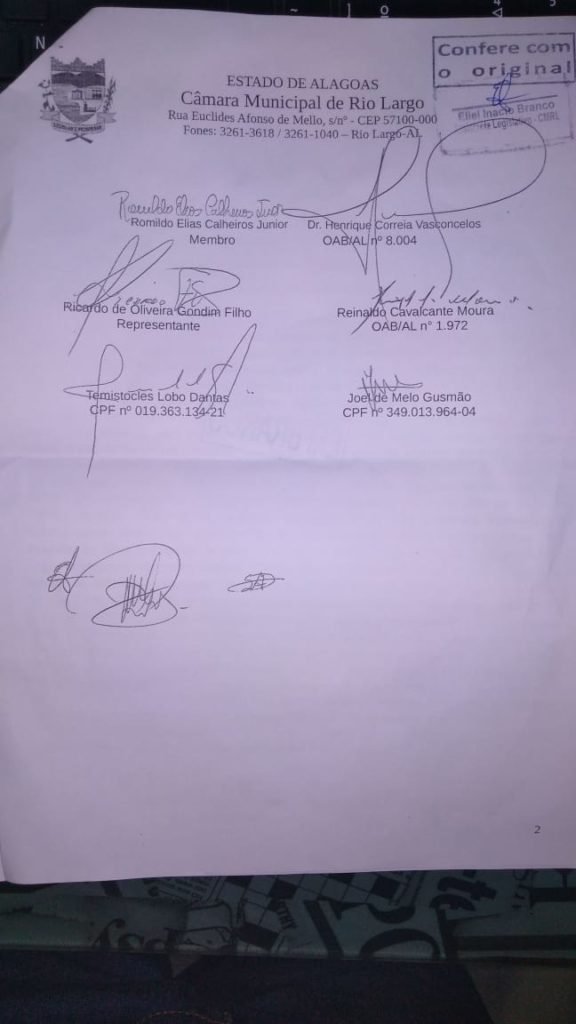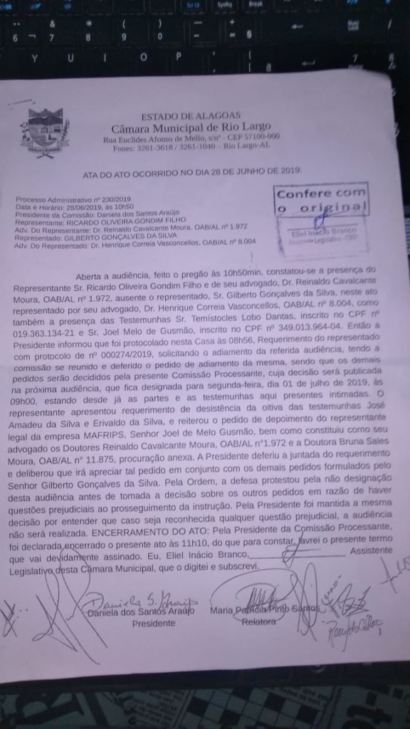 A audiência estava marcada para esta sexta-feira, às 10h50, na Câmara Municipal de Rio Largo. A presidente da Comissão Processante, Daniela dos Santos Araújo. Pouco antes do horário marcado para a audiência, a defesa de Gilberto Gonçalves ingressou com um requerimento protocolado sob o nº 000274/2019, pedindo o adiamento da audiência. O pedido foi feito pelo advogado Henrique Correia Cavalcante. O advogado alegou que Gilberto Gonçalves estava em viagem oficial “tratando de interesses do município”.