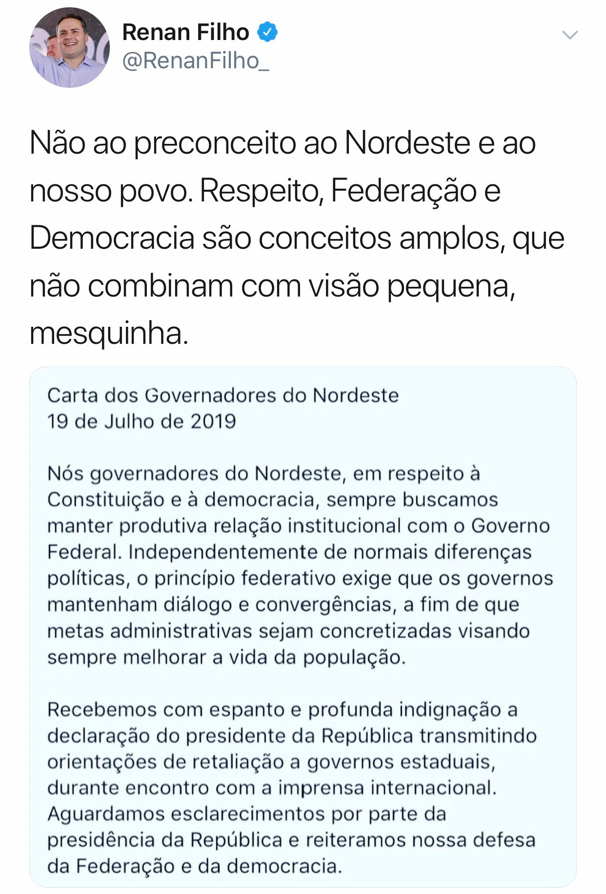 Por meio de seu perfil no Twitter, Renan Filho chama a atitude de “visão pequena” e “mesquinha”. “Não ao preconceito ao Nordeste e ao nosso povo. Respeito, Federação e Democracia são conceitos amplos, que não combinam com visão pequena, mesquinha”, declarou o governador, que é filho do senador Renan Calheiros (MDB-AL). (Redação A Notícia e Veja)