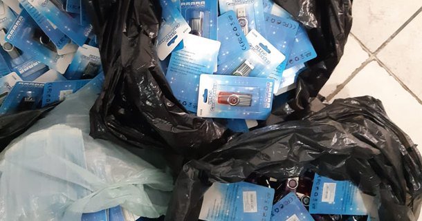 No fim da manhã, os agentes abordaram o veículo Vw/Fox 1.6 Plus, de cor prata, com três ocupantes. Durante os procedimentos de verificação ao interior do carro, os policiais encontraram seis sacolas pretas no porta-malas, contendo aproximadamente 1.600 adaptadores de pendrive e 207 cartões de memória.