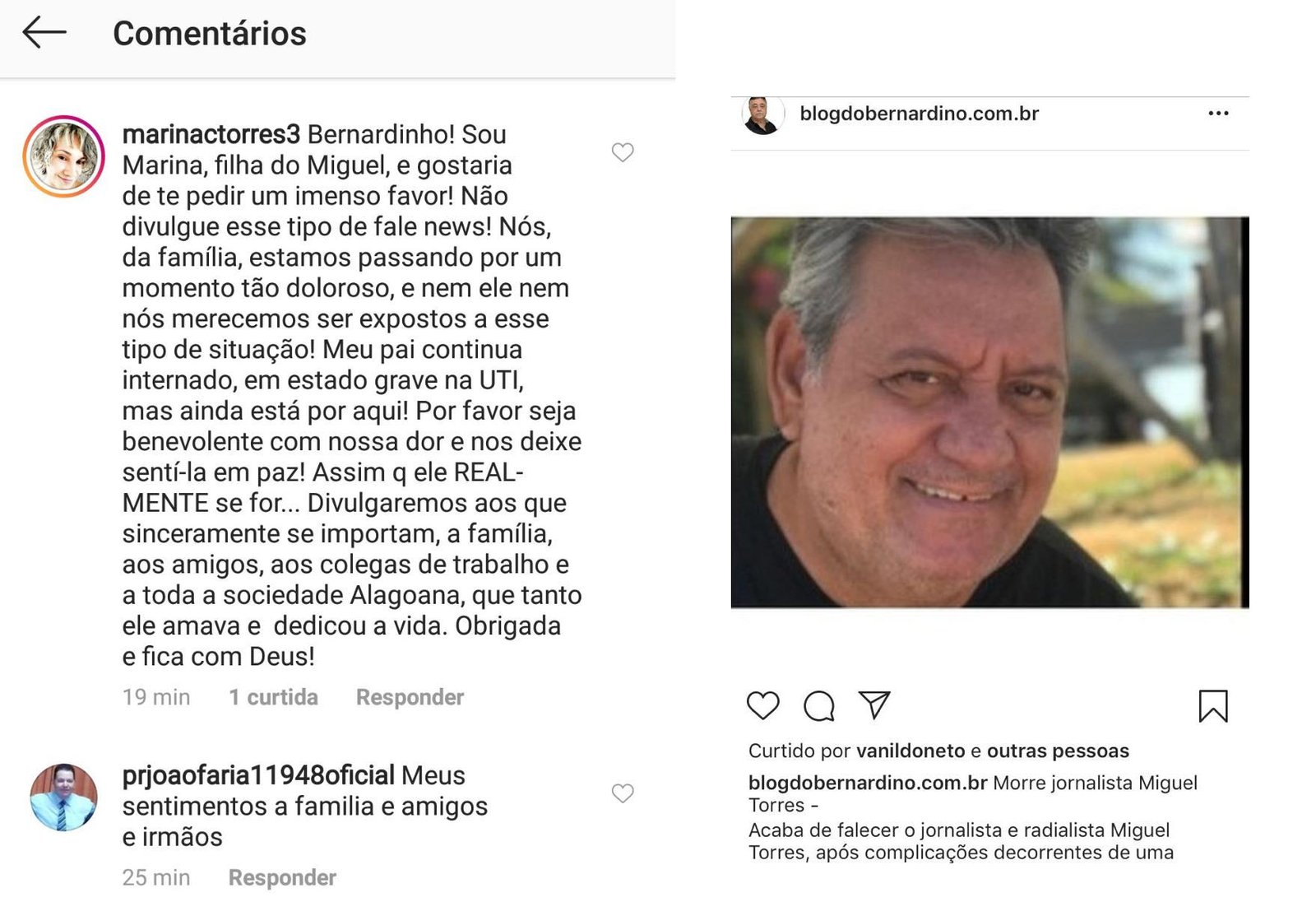 A filha do jornalista, Marina Torres, deixou um comentário na publicação do Blog do Bernardino para que ele apagasse a imagem e parasse de divulgar fake news.