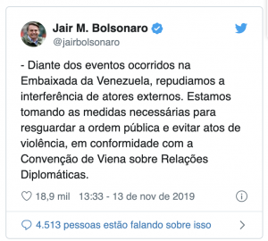 Bolsonaro afirmou que repudia a interferência de atores externos no conflito do país vizinho. “Estamos tomando as medidas necessárias para resguardar a ordem pública e evitar atos de violência, em conformidade com a Convenção de Viena sobre Relações Diplomáticas”.