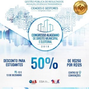 Nos dias 12 e 13 de dezembro, acontece no Centro de Exposições de Maceió, no bairro do Jaraguá, o Congresso Alagoano de Direito Municipal e Eleitoral.
