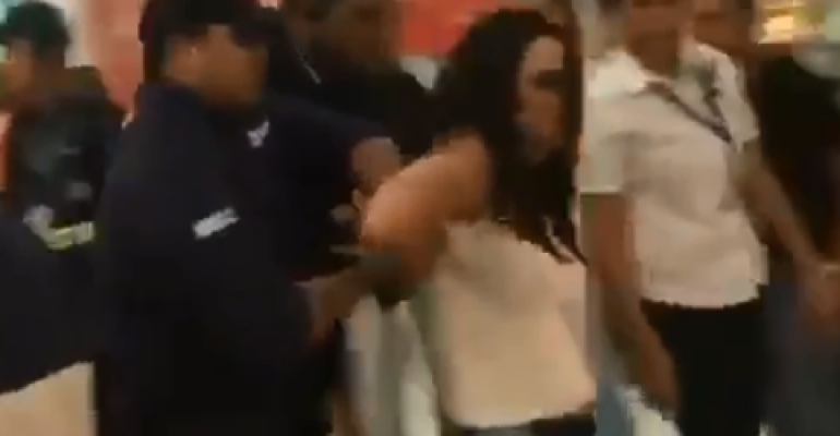 Ela chegou a subir em uma das mesas da praça de alimentação para pedir respeito e anunciar que chamaria a polícia mas, sob os aplausos de alguns dos presentes e protestos de outros, foi expulsa pelos seguranças.