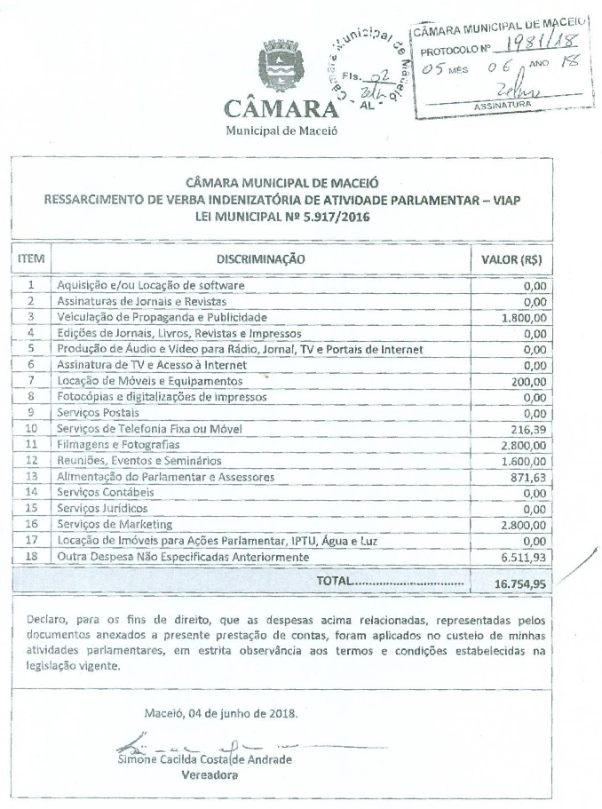 A maior solicitação de reembolso mensal de toda a legislatura atual foi de R$16.754, em maio de 2018 e foi realizada pela vereadora Simone Andrade(DEM). No detalhamento dos gastos, mais de R$6mil não foram especificados, constando apenas como “Outra despesa não especificada anteriormente”. Pelo portal da transparência não é possível saber se a solicitação de reembolso foi atendida. Veja abaixo.