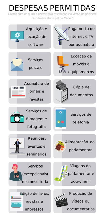 O benefício, mais conhecido como verba de gabinete, não é exclusividade dos vereadores de Maceió. Senadores, deputados estaduais e federais também têm direito ao reembolso por gastos parlamentares. Na capital, a lei que institui a Verba Indenizatória de Atividade Parlamentar dos Vereadores (VIAP) passou a vigorar em 2010 e estabelece diversos critérios para que o reembolso seja concedido. Conheça as regras no quadro abaixo.