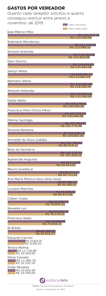 A Agência Tatu analisou os dados existentes no portal da transparência da Câmara e verificou que, somente em 2019, os legisladores da Câmara Municipal receberam um total de R$2,14 milhões dos cofres públicos a título de ressarcimento por despesas no exercício da atividade parlamentar. Veja no gráfico abaixo quanto cada parlamentar recebeu no último ano.