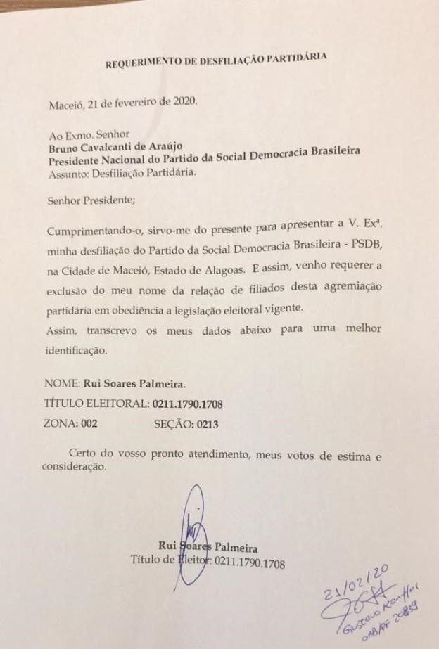 Hoje (21) O prefeito de Maceió, Rui Palmeira, comunicou sua desfiliação do partido, em carta enviada ao presidente do diretório nacional do PSDB, Bruno Araújo.