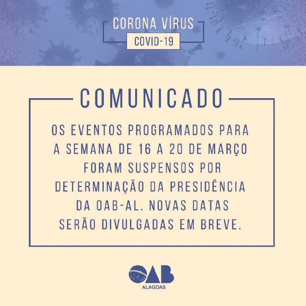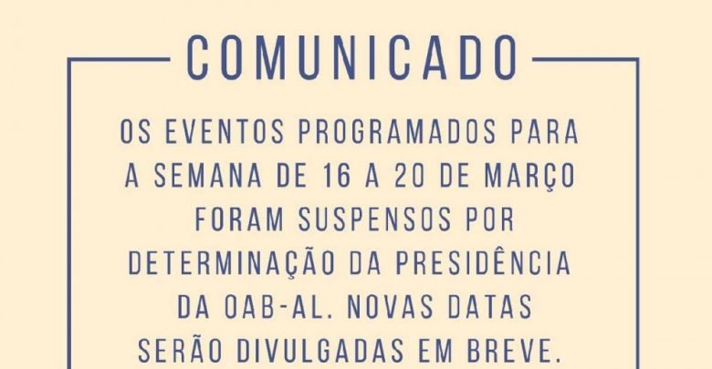 Tendo em vista o momento delicado, onde a Organização Mundial de Saúde (OMS) declarou pandemia do CODIV-19 (popularmente conhecido como Coronavírus), e seguindo as orientações de prevenção, a Ordem dos Advogados do Brasil Seccional Alagoas (OAB/AL) resolve suspender a realização de eventos marcados para a próxima semana (entre os dias 16 a 20 de março), evitando assim aglomerações. A decisão foi tomada durante reunião da Diretoria da Seccional alagoana e será publicada no Diário Oficial da OAB.