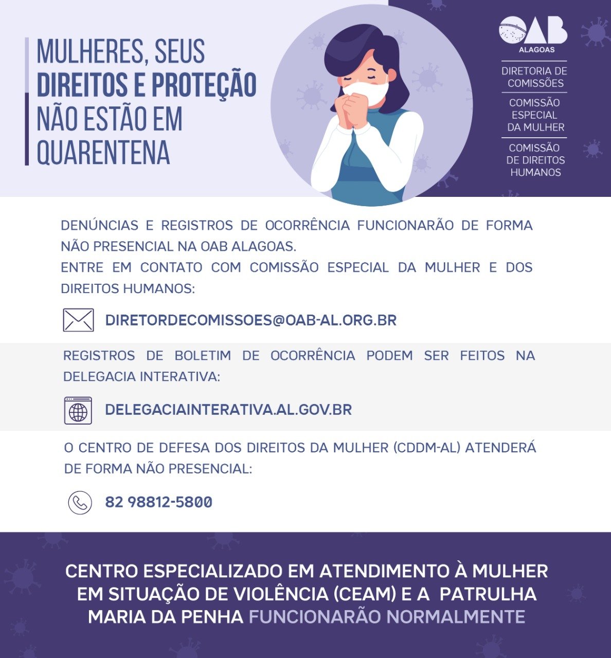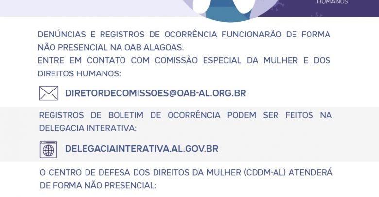 Mesmo com atendimentos presenciais e reuniões suspensas, OAB-AL, através da Comissão Especial da Mulher e dos Direitos Humanos pode ser contatada através do contato: diretordecomissoes@oab-al.org.br.