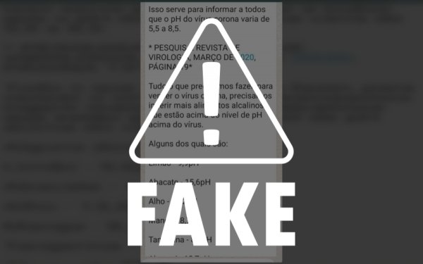 É falsa a mensagem que circula no WhatsApp, afirmando que para vencer o coronavírus bastaria consumir alimentos com o pH mais alto. A mensagem ainda cita alimentos supostamente ácidos como alho, limão, tangerina, abacate, entre outros. O texto falso ainda diz que a doença possui um pH que varia de 5,5 a 8,5 e atribui a informação a uma pesquisa, da edição de março deste ano, de uma suposta revista de virologia.