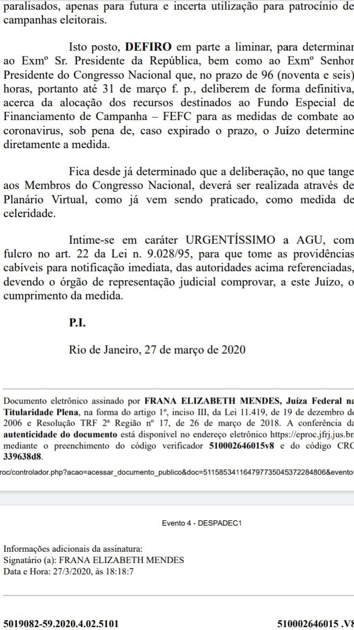 A juíza federal Frana Elizabeth Mendes, 26ª Vara Federal do Rio de Janeiro, decidiu na segunda-feira, 30, que o presidente do Congresso Nacional delibere de forma definitiva, acerca da alocação dos recursos destinados ao Fundo Especial de Financiamento de Campanha – FEFC – para as medidas de combate ao Coronavírus.