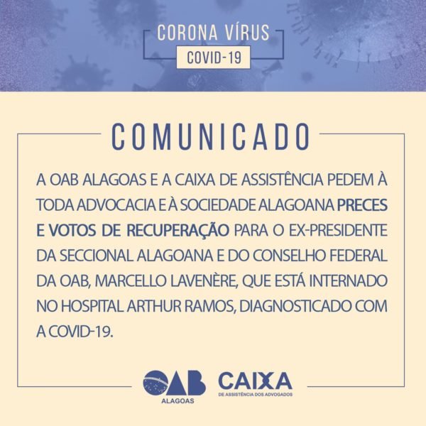 Marcelo Lavenére Machado, ex-presidente nacional da Ordem dos Advogados do Brasil, está na UTI do Hospital Arthur Ramos, em Maceió, lutando contra o coronavirus. Ele foi internado junto com a esposa que recebeu alta do hospital no dia de ontem, terça-feira, 31. Ela também havia contraído o vírus da doença que preocupa o mundo inteiro.
