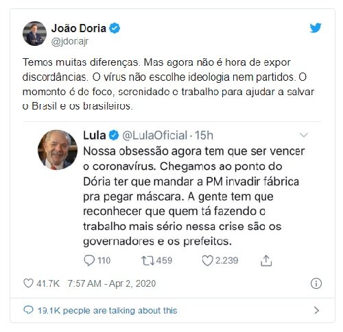 No Twitter, Lula elogiou governadores e prefeitos. Doria respondeu: