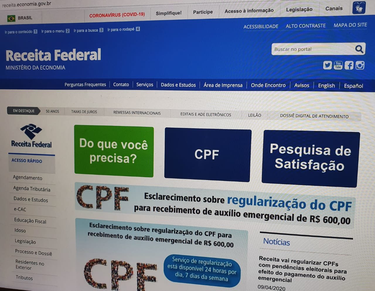 Além dos Correios, a Receita Federal informou ontem (8) que a regularização do CPF também pode ser feita no site do órgão, a qualquer hora do dia. O esclarecimento foi feito após cidadãos terem relatado dificuldades para inserir o número do CPF no aplicativo Caixa – Auxílio Emergencial.