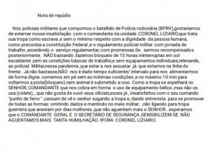 Ele reforçou que os policiais de seu batalhão estão de acordo com as medidas. “Todos os policiais têm entendido sua missão neste momento. Estamos compromissados com a sociedade, com o governo do Estado, e os nossos policiais não estão com sobrecarga nenhuma. Nosso batalhão repudia pessoas que, de forma leviana, não se identificam e postam coisas como se fosse um pensamento generalizado do batalhão, quando, na verdade, não é. É até um contrassenso o batalhão estar insatisfeito e dando resultados tão bons nas rodovias. Quem estiver insatisfeito, procure o Conselho de Segurança [Conseg], para que o Conseg possa escutar o Comando Geral e checar se há alguma irregularidade. Toda folga é dada diuturnamente”, conclui.