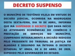 Após suspensão, a prefeitura do município alagoano informou o cumprimento da determinação. “O município de Teotônio Vilela em virtude de decisão judicial, ocorrida na madrugada desta sexta-feira, 10 de abril, informa que irá suspender o decreto. […] Cumprindo integralmente a decisão redigida pelo presidente do Tribunal de Justiça em Alagoas e seguindo na íntegra o decreto estadual Nº 69624, de 6 de abril de 2020, expedido pelo governador do Estado”, informa trecho do comunicado.