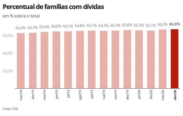 O nível de famílias endividadas é recorde no levantamento iniciado em janeiro de 2010. Em março deste ano, a taxa havia ficado em 66,2% e em abril de 2019, em 62,7%. Essa foi a primeira Peic realizada no país após o início da pandemia do coronavírus. A coleta da dados ocorreu entre 20 de março e 5 de abril deste ano.