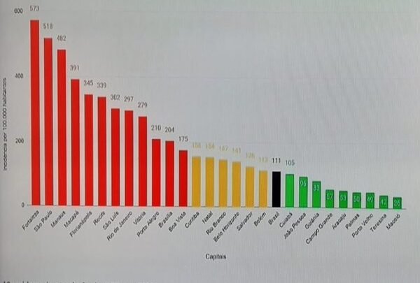 Os números registrados na capital alagoana estão abaixo, inclusive, da média nacional, que está em 111 casos para cada um milhão de habitantes. Fortaleza é a capital do país com maior taxa, ou seja, por lá são 573 casos para cada um milhão de habitantes, número cinco vezes maior que a média nacional. Logo em seguida, aparecem São Paulo (518), Manaus (482), Macapá (391) e Florianópolis (345).