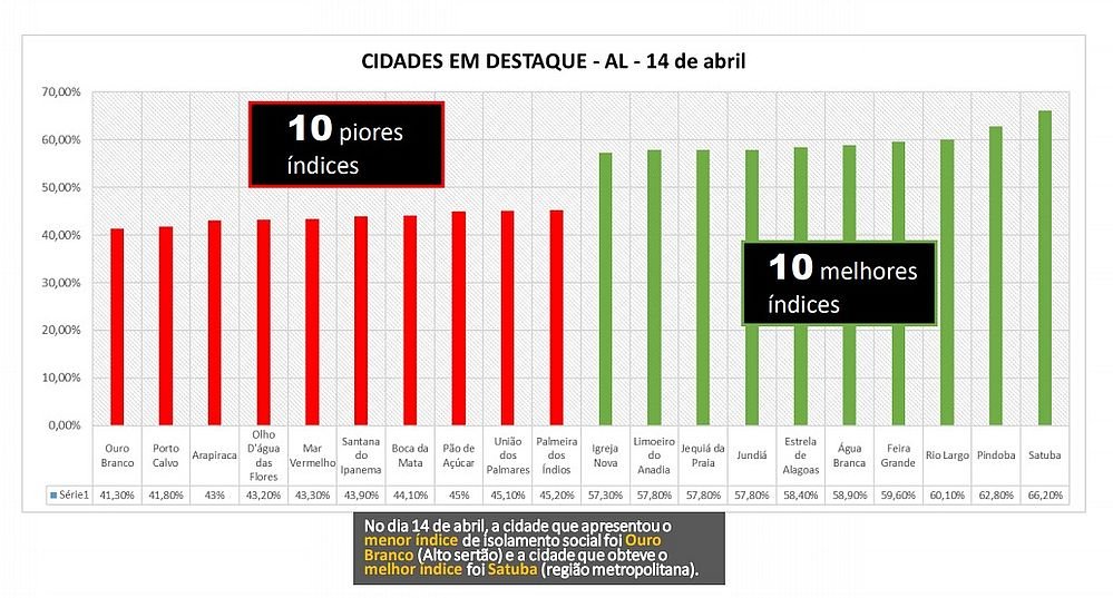 Os dados apurados no dia 14 de abril revelaram que o município de Satuba, na região metropolitana de Maceió, teve o melhor indicativo, com 66,2% de isolamento. A cidade alagoana que menos respeitou a orientação dos órgãos de saúde foi Ouro Branco, no Alto Sertão, com apenas 41,3% de pessoas.