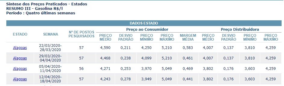 De acordo com o Ato Cotepe Nº 10, de 9 de abril de 2020, com validade para cobrança do ICMS a partir de 16 de abril, o valor médio de referência da gasolina em Alagoas (PMPF) é de R$ 4,7050. O valor de referência anterior era de R$ 4,7547. Na situação percebida atualmente, este valor está pelo menos R$ 0,50 a mais do que o valor pesquisado pela ANP (Agência Nacional do Petróleo, Gás Natural e Biocombustíveis), que é por volta de R$ 4,20.