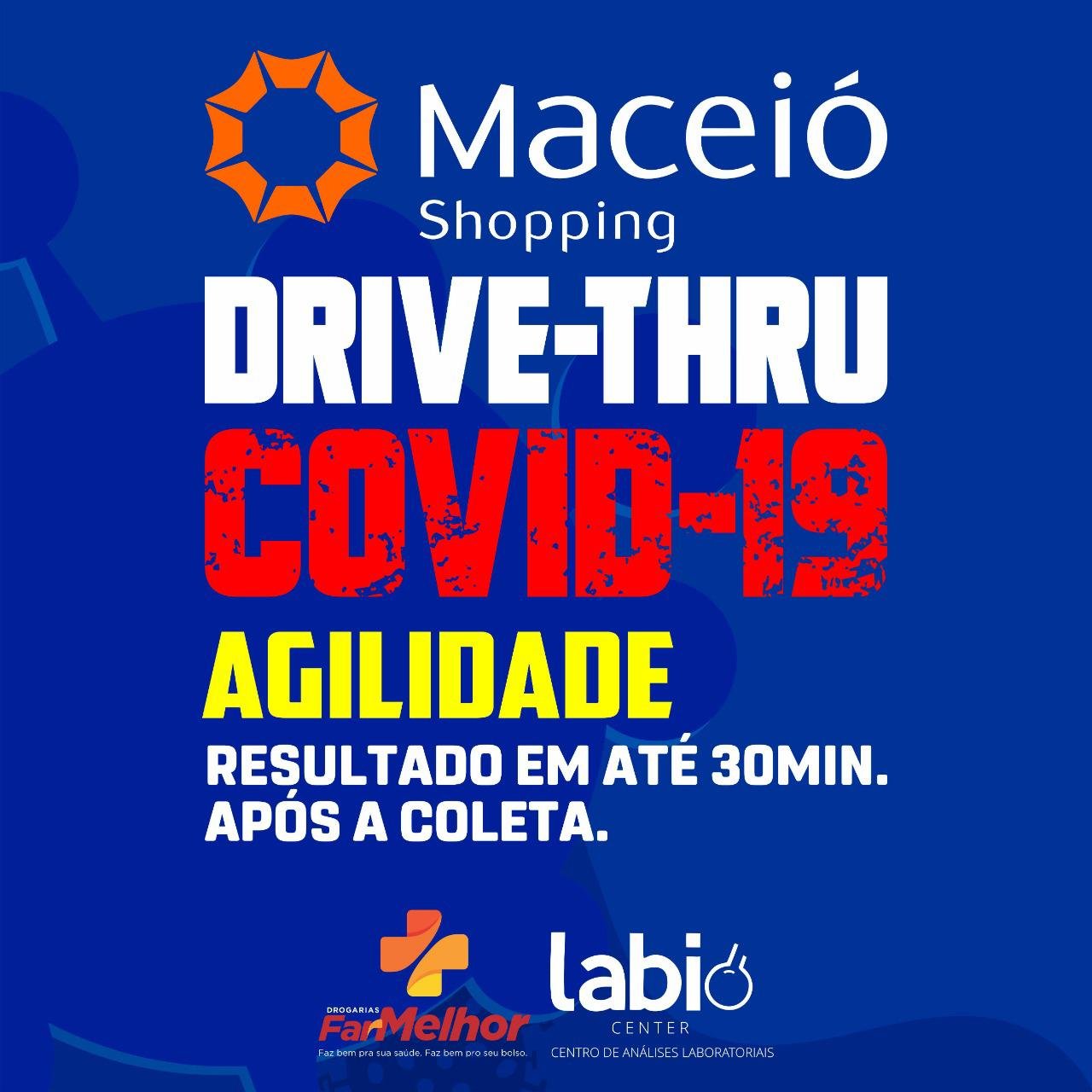 De forma segura e prática, o laboratório Labio Center realizará testes rápidos para detecção da Covid-19 (Nutriex Covid-19 e IgG/IgM), no drive-thru do estacionamento do Shopping Maceió. A coleta poderá ser feita de segunda-feira a domingo, das 8h às 17h.