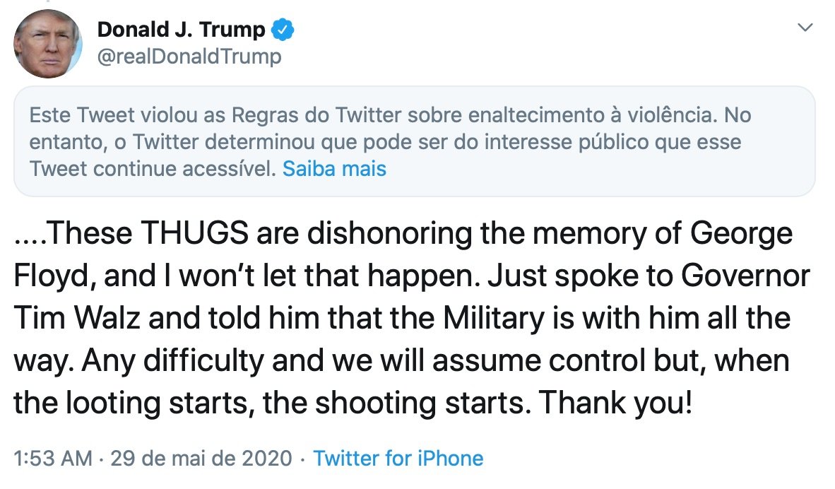 Em resposta, o Twitter incluiu um aviso de que a mensagem promove a “violação da violência”, em uma escalada do embate entre o presidente americano e a rede social. “Estes BANDIDOS estão desonrando a memória de George Floyd, e eu não deixarei que isso aconteça. Acabei de conversar com o governador Tim Waltz e disse que o Exército está com ele até o fim. Qualquer dificuldade e nós assumiremos o controle, mas quando começam os saques, começam os tiros”, tuitou Trump. A mensagem gerou indignação na rede social por sugerir o emprego de armas de fogo contra manifestantes.