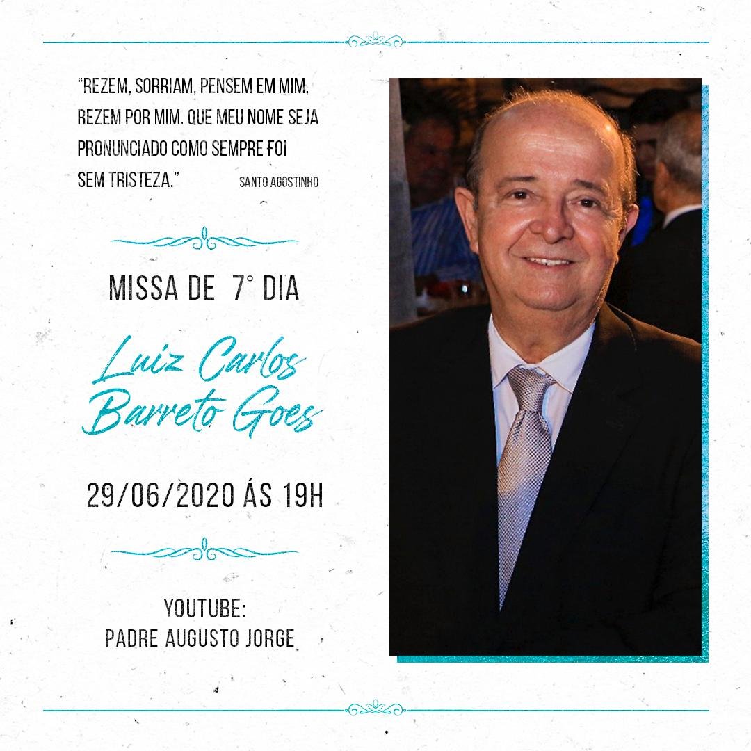 A família de Luís Carlos Barreto Goes convida os amigos para a missa de sétimo dia a ser realizada no dia 29 de junho, às 19 horas, que será transmitida ao vivo pelo canal YouTube do Padre Augusto Jorge.