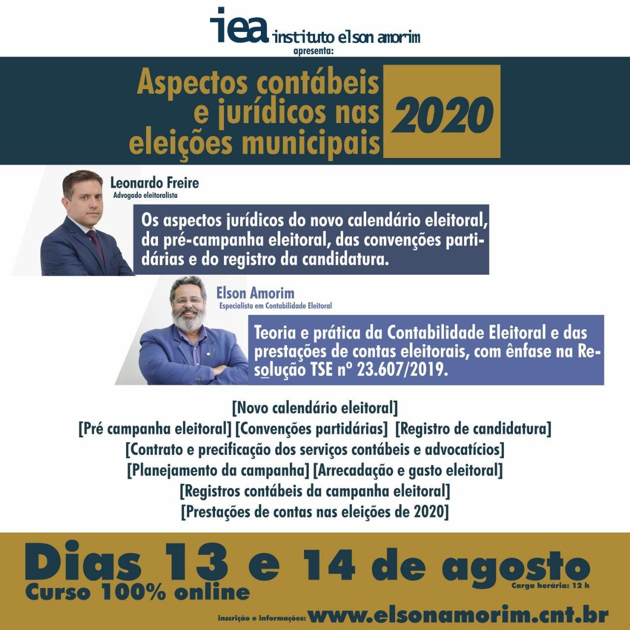 De forma totalmente on-line, ao vivo, o Instituto Elson Amorim realizará, nos dias 13 e 14 deste mês, o curso “Aspectos Contábeis e Jurídicos nas Eleições Municipais 2020”, voltado para profissionais da contabilidade, advogados, dirigentes de partidos e futuros candidatos, com os facilitadores Elson Amorim -contabilista eleitoral – e Leonardo Freire – advogado eleitoralista.