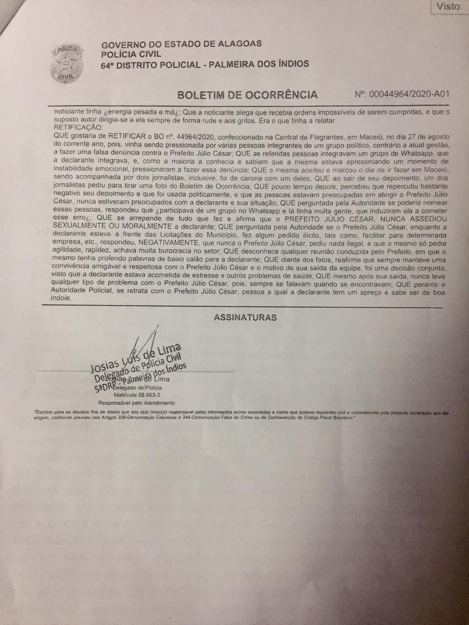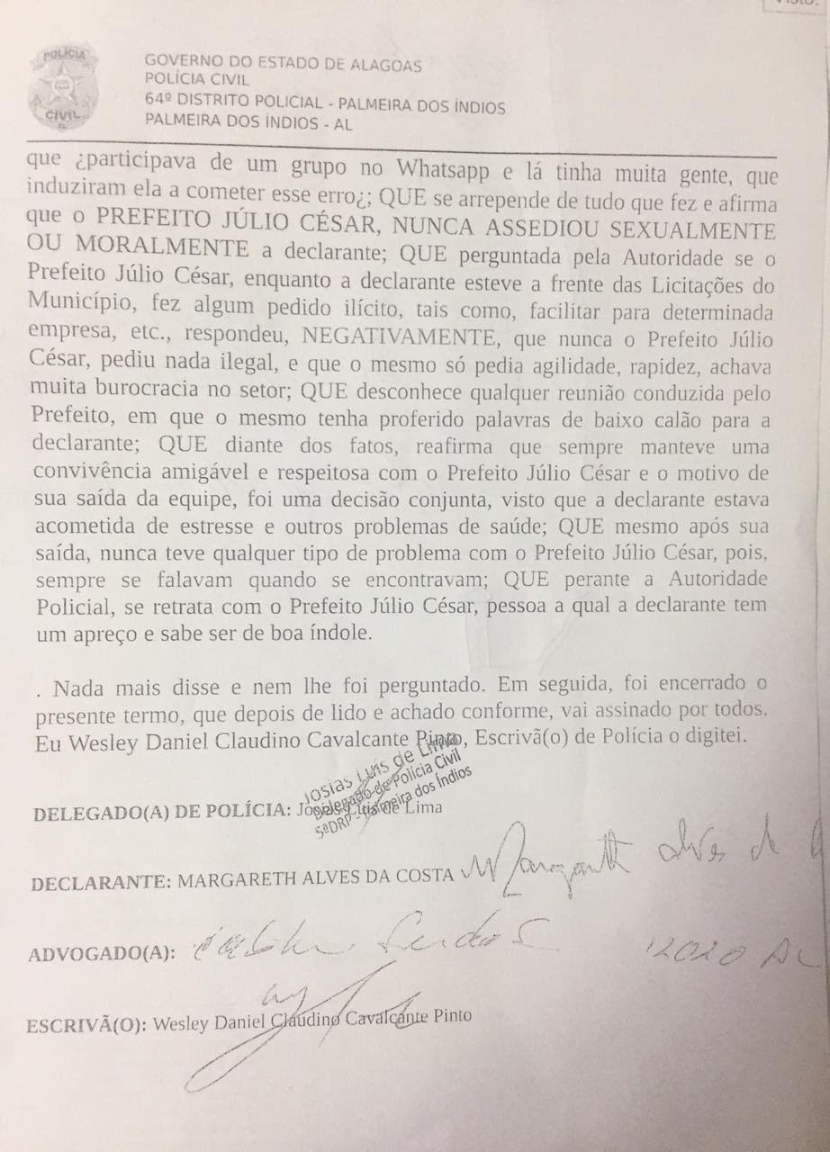 Também informou à Polícia Civil que estava em um quadro de depressão. “Júlio Cezar nunca me assediou sexualmente ou moralmente” esclareceu. Diante dos fatos, disse também que sempre manteve uma convivência amigável e respeitosa com o prefeito.