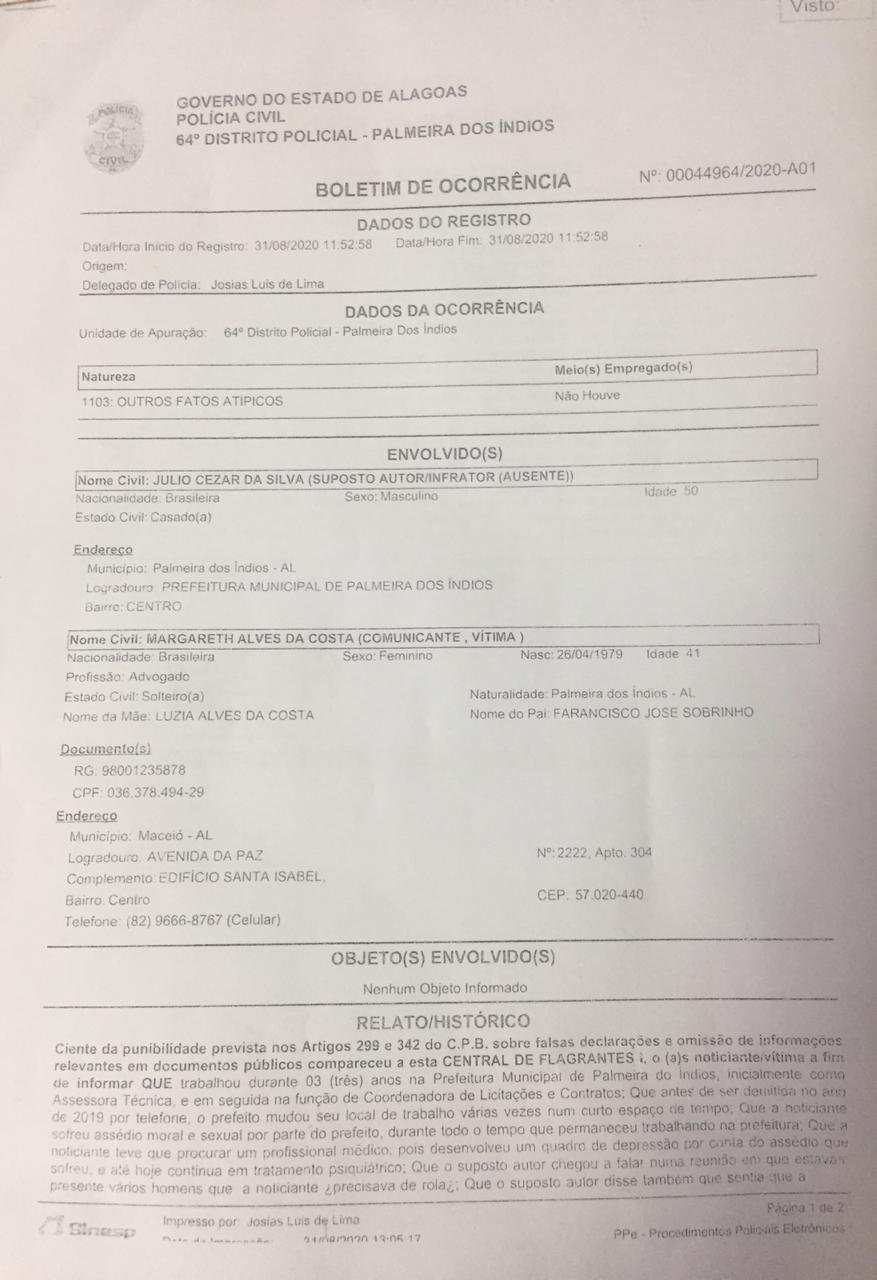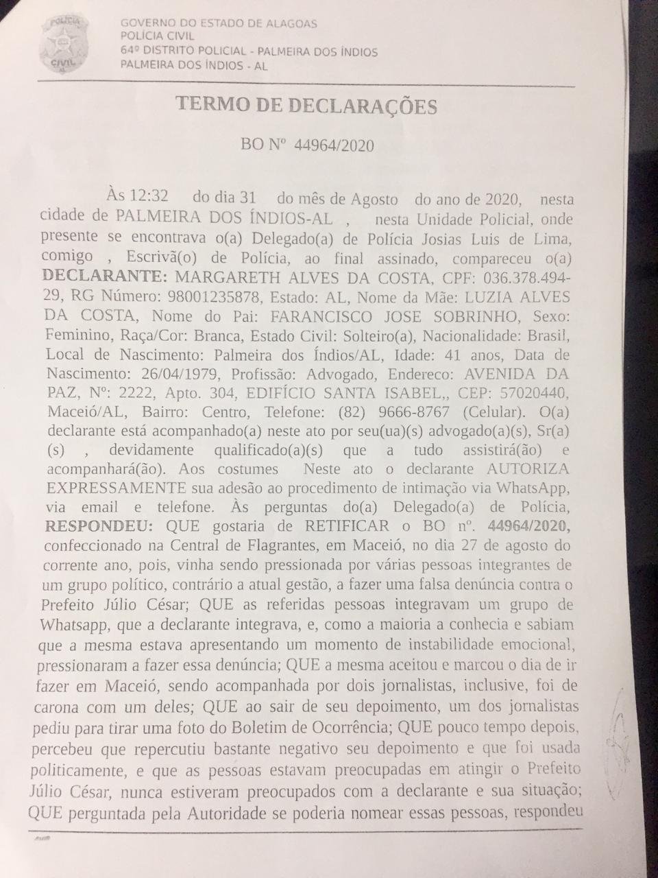 A advogada Margareth Alves da Costa, que acusou o prefeito de Palmeira dos Índios de assédio sexual, retirou sua denúncia na Polícia Civil. No novo boletim de ocorrência, ela informou que estava sendo pressionada por concorrentes políticos do prefeito a fazer uma falsa denúncia.