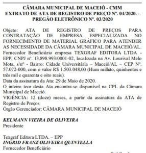 Vamos lembrar! A Câmara Municipal de Maceió publicou no dia 5 de junho deste ano pregão eletrônico para contratação de empresa especializada no fornecimento de material gráfico.