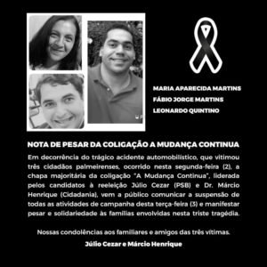 Em decorrência do trágico acidente automobilístico, que vitimou três cidadãos palmeirenses, ocorrido nesta segunda-feira (2), a chapa majoritária da coligação “A Mudança Continua”, liderada pelos candidatos à reeleição Júlio Cezar (PSB) e Dr. Márcio Henrique (Cidadania), vem a público comunicar a suspensão de todas as atividades de campanha desta terça-feira (3) e manifestar pesar e solidariedade às famílias envolvidas nesta triste tragédia.