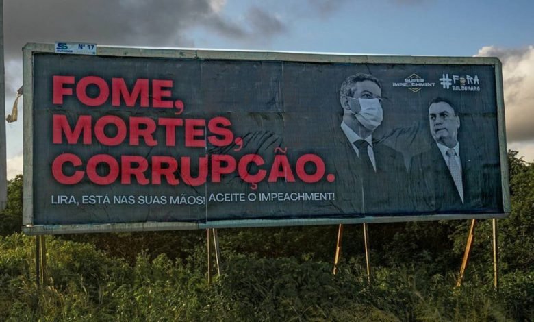 Em outra peça, aparecem os dizeres: “Fome, mortes, corrupção”, com a foto de Lira ao lado de Bolsonaro. No painel, também consta outro apelo ao presidente da Câmara: “Lira, está em suas mãos! Aceite o impeachment”.