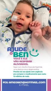 O pequeno Benjamin Brener Guimarães, filho de Tulio Guimarães e Nathalie Guimarães, foi diagnosticado com uma doença genética degenerativa rara e grave chamada AME tipo 1 (Atrofia Muscular Espinhal), que pode acometer uma em cada 10 mil crianças.