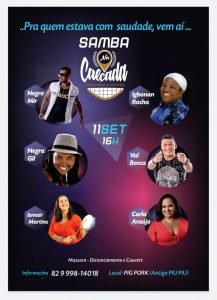 É o Samba na Calçada. O reencontro do Samba com Alagoas que reunirá 7 dos melhores representantes do samba do nosso estado. Todos no mesmo lugar e no mesmo dia. Artistas renomados e que foram impedidos de executar justamente a profissão que abraçaram e que ficaram nesse período impossibilitados de a exercerem , sem renda e vivendo de sacrifícios.