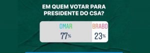 Como resultado da eleição de hoje para a presidência do Centro Sportivo Alagoano (CSA) pesquisa feita pelo programa CBN Esportes aponta a eleição de Omar Coelho como o futuro presidente do Clube para os próximos 4 anos, com uma larga vantagem sobre o seu adversário, Marcelo Brabo.